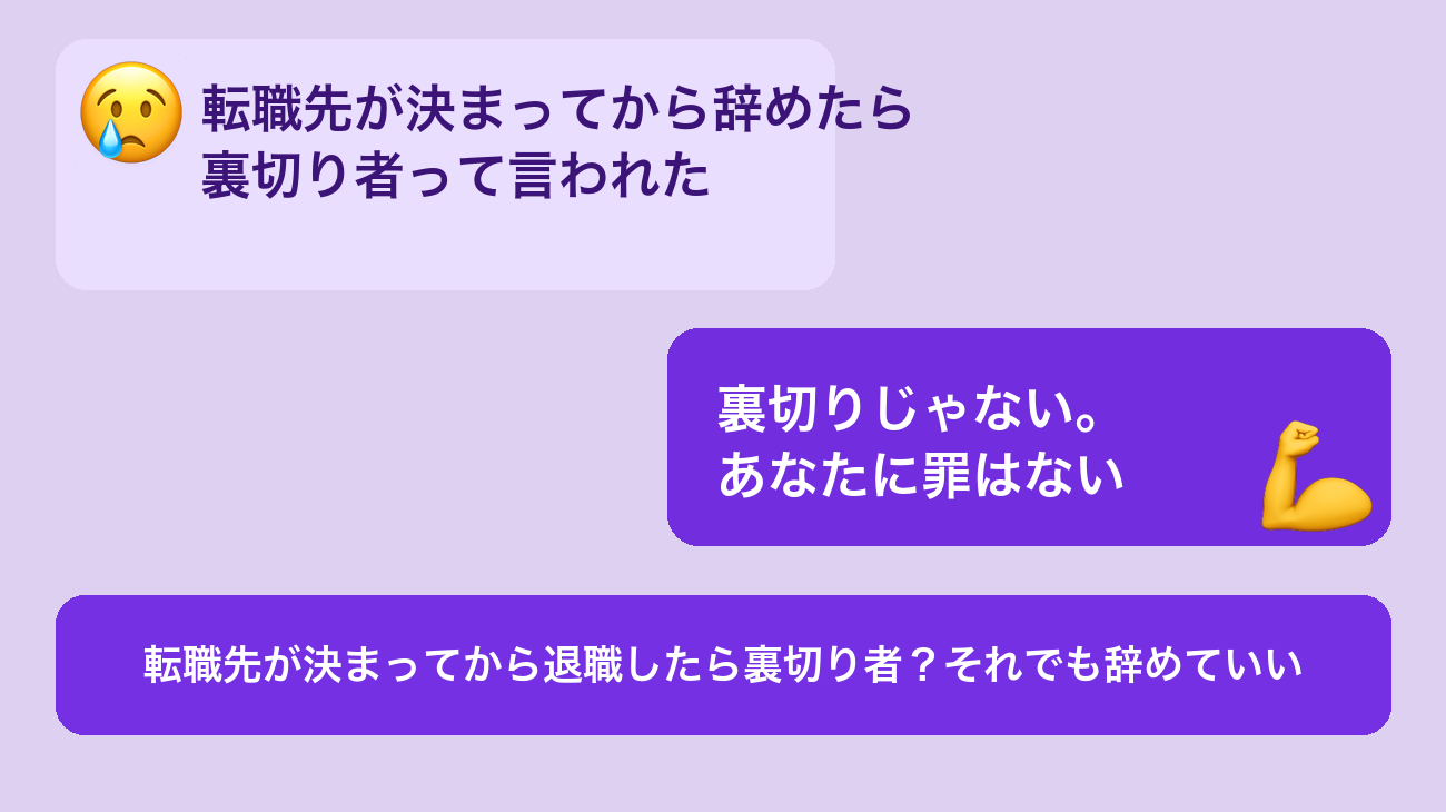 「裏切り者」は法律用語でも何でもありません。あなたが退職を申し出ることで、会社に具体的な損害を与えたわけでもありません。その言葉の重さに、必要以上に引きずられないでほしいと思います。